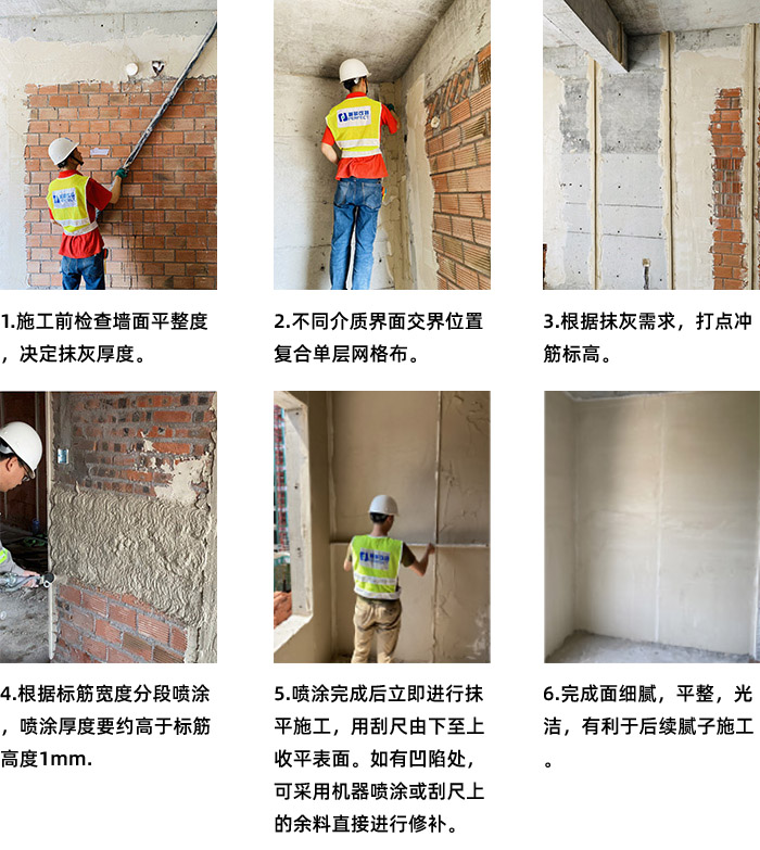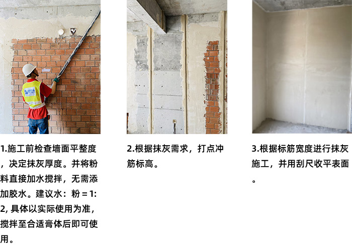 4. 夏季施工以及高吸水率墙体,建议墙面预先洒水或滚涂乳液型界面剂,待其表面无水珠滴落时进行施工